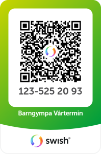 Ditt barn får prova vid första tillfället, och om ni därefter inte vill fortsätta behöver ni höra av er till allstabarngympa@gmail.com. Om ni väljer att fortsätta i gruppen sker betalning av terminsavgiften helst via Swish där du enklast använder denna QR-kod: